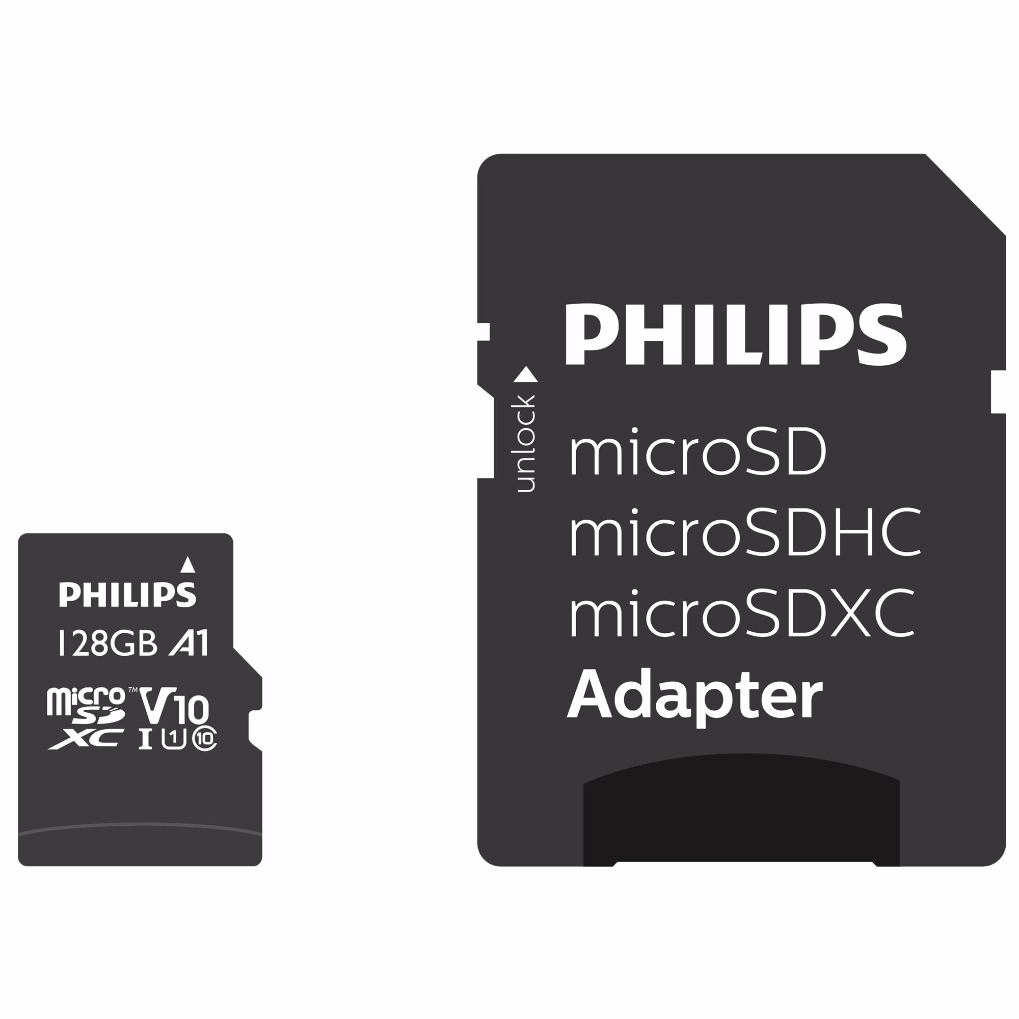 Produktübersicht:<b>Für anspruchsvolle Anwendungen</b><br>Philips UHS-I U1 Speicherkarten der Klasse 10 bieten die richtige Leistung für Anwendungen, die eine hohe Schreibgeschwindigkeit erfordern, wie Full HD-Videoaufnahmen.<br><br><b>128 GB Speicherkapazität</b><br>Bietet ausreichend Kapazität für mehr als 36.000 Fotos oder 1.280 Minuten Full HD-Video.*<br><br><b>Videoklasse V10</b><br>Die Geschwindigkeit der Videoklasse V10 bietet die richtigen Spezifikationen für Full HD-/HD-Videoaufnahmen<br><br><b>Schnelle App-Leistung A1</b><br>Unterstützt die schnelle App-Leistung A1, damit Benutzer Apps schneller über die Speicherkarte ausführen können.<br><br><b>UHS-I</b><br>Diese UHS-I-Speicherkarte wurde für die Aufzeichnung hochwertiger Videos in Echtzeit ohne Pufferung entwickelt.<br><br><b>Micro SDXC</b><br>Das Micro SDXC-Format (Secure Digital EXtended Capacity) bietet größere Kapazitäten und höhere Übertragungsgeschwindigkeiten als das herkömmliche Micro SD-Format.<br><br><b>Erweitern Sie Ihre Speicherkapazität</b><br>Erweitert Ihr (Mobil-) Gerät ganz einfach um zusätzliche Speicherkapazität.<br><br><b>SD-Adapter im Lieferumfang enthalten</b><br>Mit dem im Lieferumfang enthaltenen Micro SD-Adapter können Sie die Micro SD-Karte in jedem Gerät verwenden, das eine herkömmliche SD-Karte nutzt.<br><br><b>Die richtige Wahl für Ihr Gerät</b><br>Kann in einer Vielzahl von Geräten mit Micro SD-Kartensteckplatz verwendet werden, z. B Smartphones, Tablets, Drohnen, Navigationssysteme und mehr.